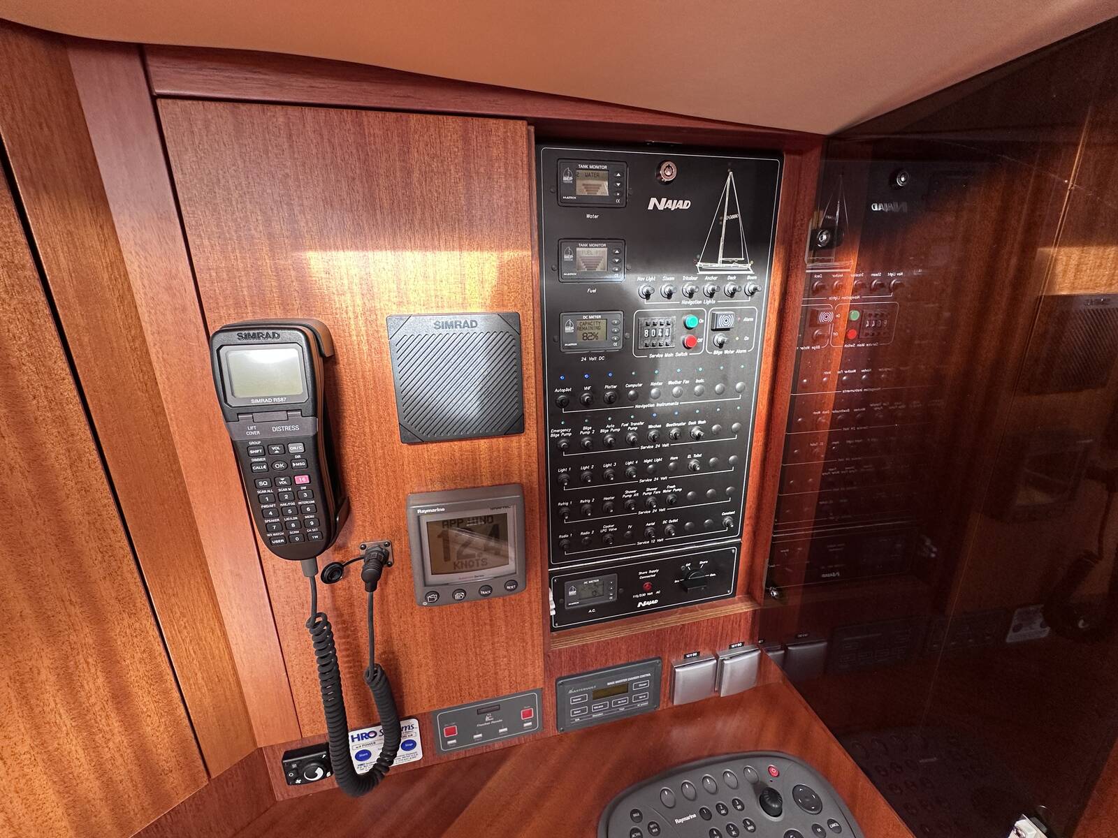 Simrad fixed VHF at chart table. Cockpit command mic and speaker.