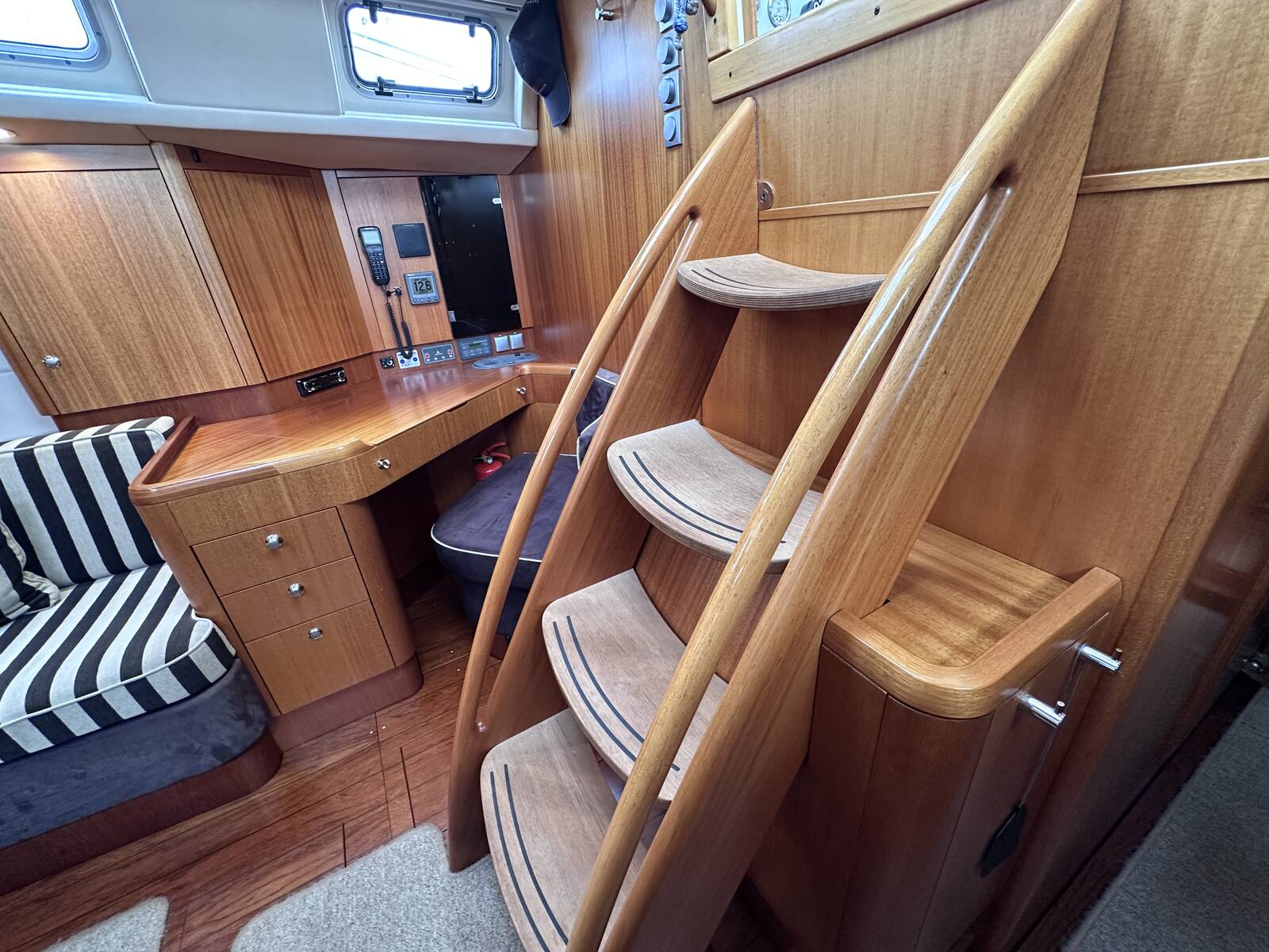 Companion way steps non slip with curved handrails made from single piece of timber