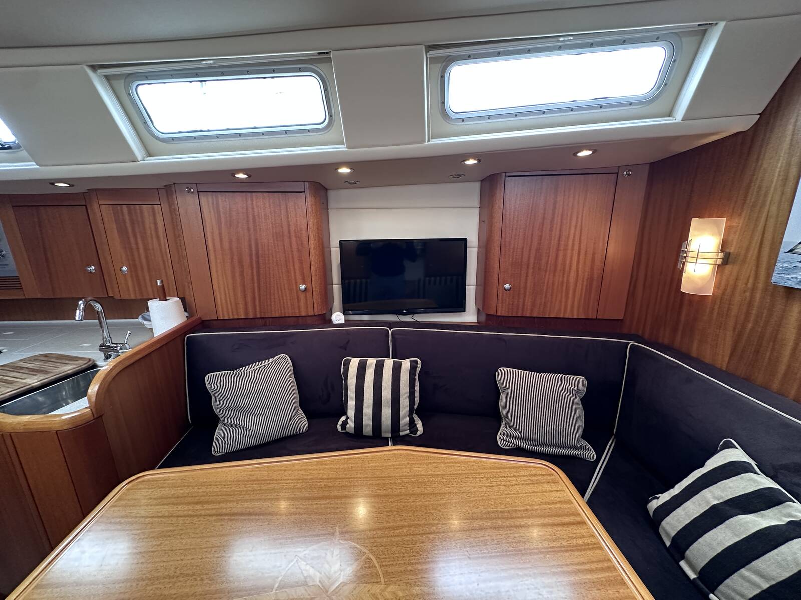 High quality varnish finish to cockpit dining table, also on all area around companion way and to the companion way hatch.